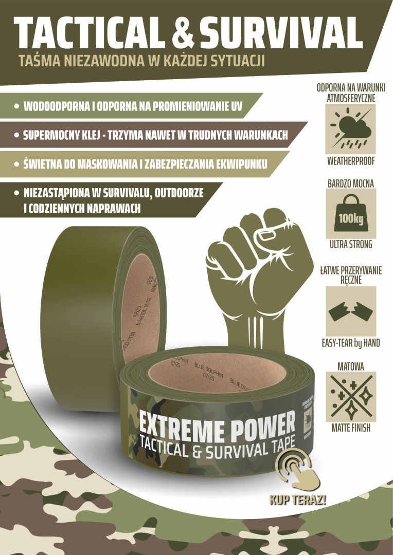 Taśma Extreme Power Tactical & Survival Tape to niezawodne narzędzie w każdej sytuacji terenowej, taktycznej i survivalowej. Stworzona z myślą o ekstremalnych warunkach, łączy wyjątkową siłę klejenia, odporność na wodę, promieniowanie UV i zmienne temperatury. Jej kamuflażowy wzór camo doskonale sprawdza się w terenie, zapewniając dyskrecję i estetykę w stylu militarnym.